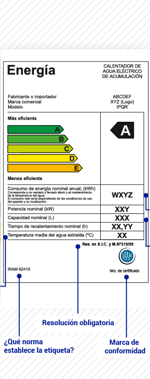 Esta etiqueta califica la eficiencia mediante un sistema comparativo que se compone de cinco clases de eficiencia identificadas como A, B, C, D y E donde la clasificación A se le adjudica a los termotanques eléctricos más eficientes y la E a los menos eficientes.
