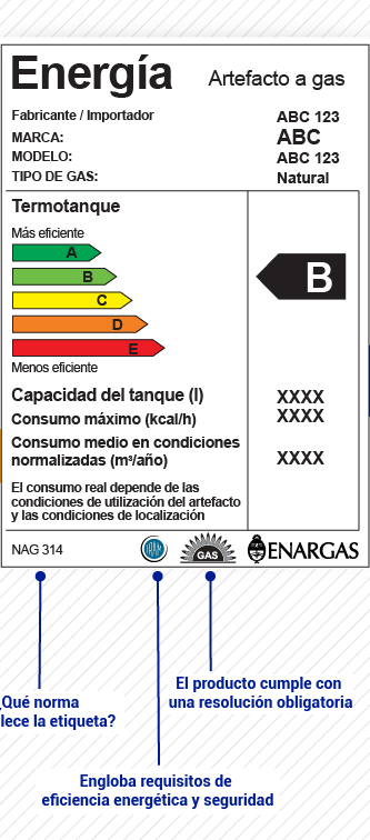 Esta etiqueta califica la eficiencia mediante un sistema comparativo que se compone de cinco clases de eficiencia identificadas como A, B, C, D y E donde la clasificación A se le adjudica a los termotanques a gas más eficientes y la E a los menos eficientes.
