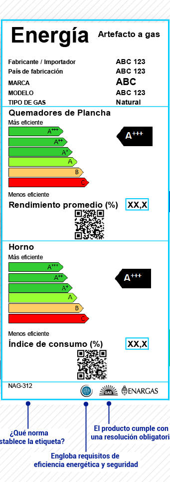 Esta etiqueta califica la eficiencia mediante un sistema comparativo que se compone de dos escalas, una para los quemadores de plancha (hornallas) y otra para el horno, de seis clases de eficiencia identificadas como A+++, A++, A+, A, B, y C, donde la clasificación A+++ se le adjudica a las cocinas, hornos y anafes más eficientes y la C a los menos eficientes.
