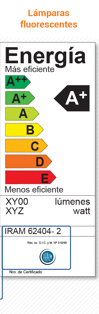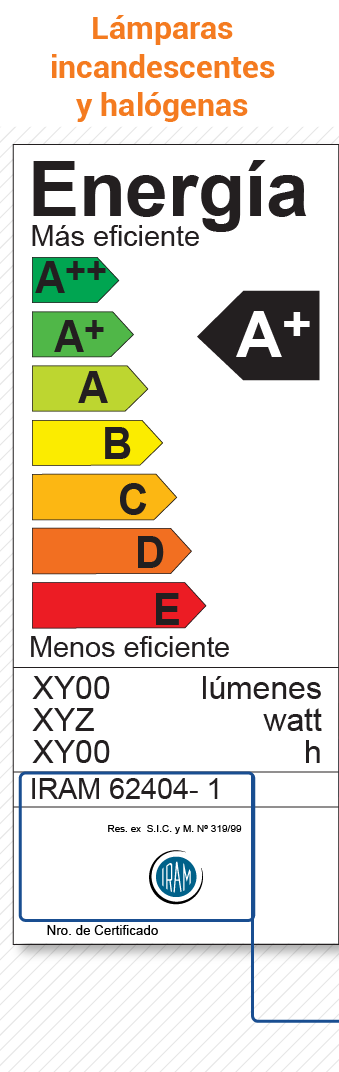 Según las Normas IRAM 62404-1 e IRAM 62404-2 que establecen las etiquetas de lámparas incandescentes y halógenas y fluorescentes, las mismas se deben colocar, imprimir o adherir en la parte externa de cada embalaje individual de la lámpara. A su vez, el fabricante puede optar por una versión policromática donde las escalas figuran en color o bien por una monocromática (blanco y negro).