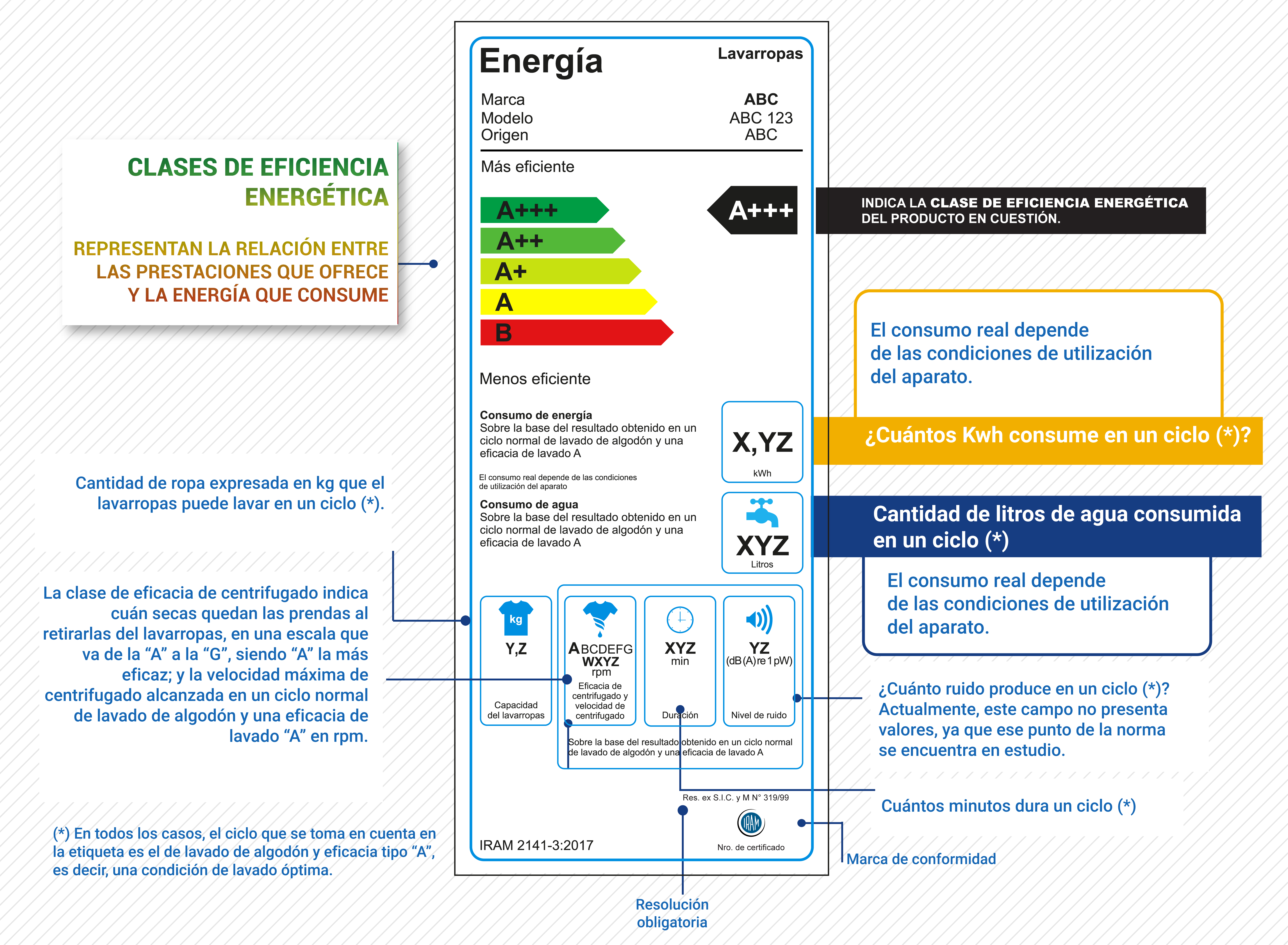 Esta etiqueta califica la eficiencia energética mediante un sistema comparativo que se compone de cinco clases de eficiencia identificadas por las letras A+++, A++, A+, A y B, donde la letra A+++ se le adjudica a los lavarropas eléctricos más eficientes y la B a los menos eficientes. Cabe señalar que por resolución de la ex Secretaría de Energía para comercializar lavarropas es necesario que los productos tengan una clase de eficiencia energética “B” o superior.